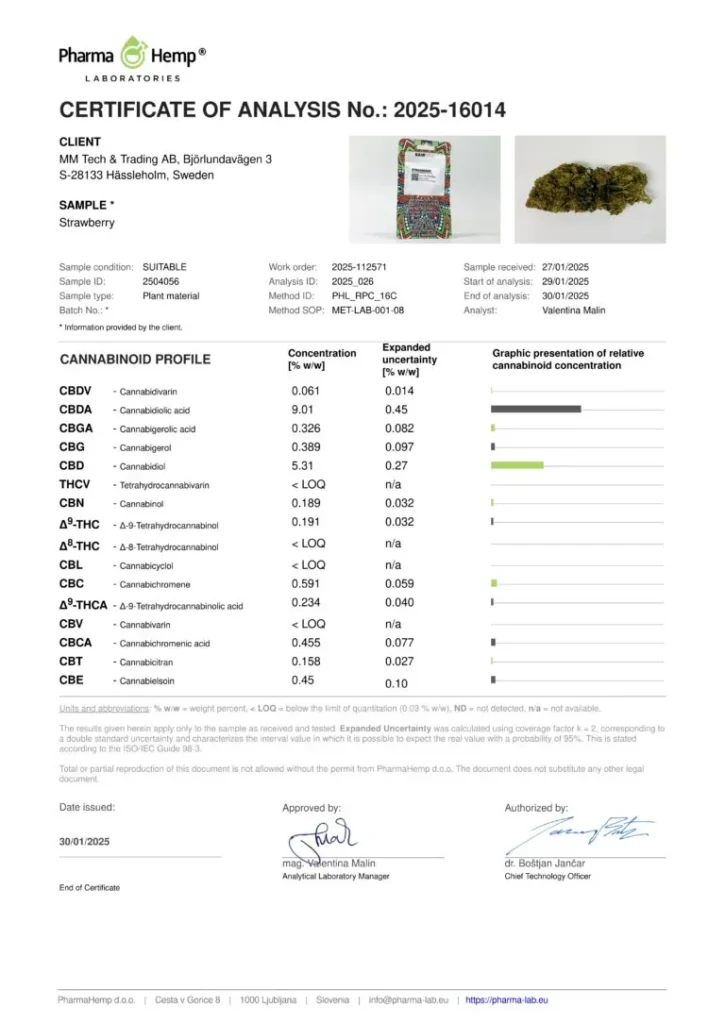 Strawberry to kwiat CBD uprawiany na zewnątrz na Sardynii. Klimat wyspy jest idealny dla konopi, z długimi słonecznymi dniami i łagodnymi wiatrami, które pozwalają roślinom dobrze się rozwijać. Kwiaty są zwarte i różnią się nieznacznie wielkością, mają świeży zielony kolor i wyraźne słupki. Zawartość kannabinoidów waha się między 17-19%, z poziomem THC poniżej 0,3%.